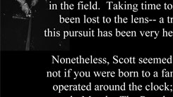 Nonetheless, Scott seemed suited for it. Customarily, photography would present plenty of problems to a ‘night person’, but